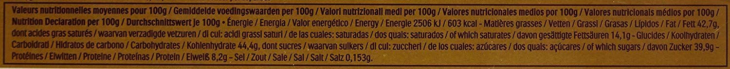 MILK Chocolate 30% (Sugar, Cocoa Butter, Cocoa Mass, Skimmed MILK Powder, Concentrated BUTTER, Emulsifier: Lecithins (SOYA), Vanillin), HAZELNUTS (28.5%), Sugar, Palm Oil, WHEAT Flour, Whey Powder (MILK), Fat-Reduced Cocoa, Emulsifier: Lecithins (SOYA), Raising Agent (Sodium Bicarbonate), Salt, Vanillin. Contains: Hazelnuts, Milk, Soya, Wheat.